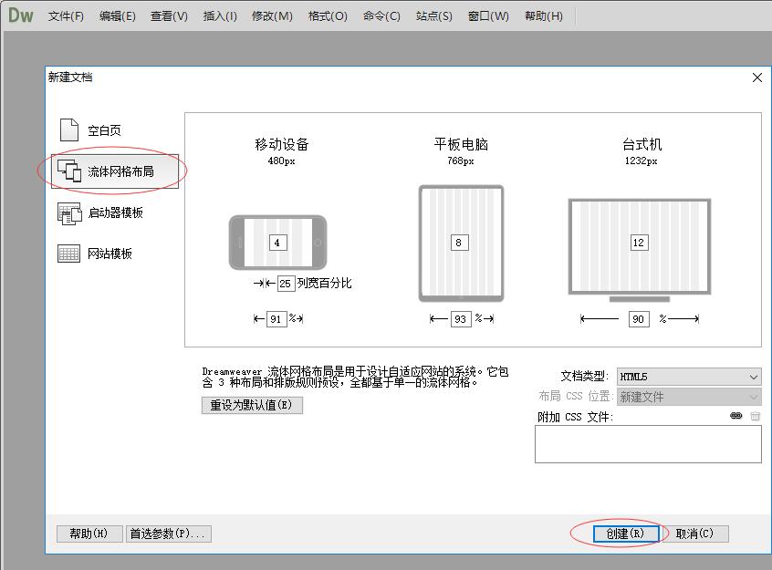 2、index.html我们可以用Dreamweaver CC来新建,操作如下:点击文件菜单,再点新建,在弹出的窗口中点流体网格布局,再点创建。