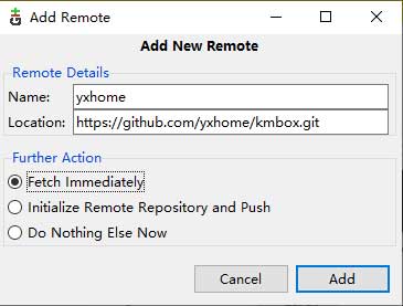 接着在弹出的对话框输入你Github的用户名和你需要将你本地的项目放在Github的远程仓库的地址,例如我在Github上创建了一个yxhome名称为kmbox的代码仓库,如下: